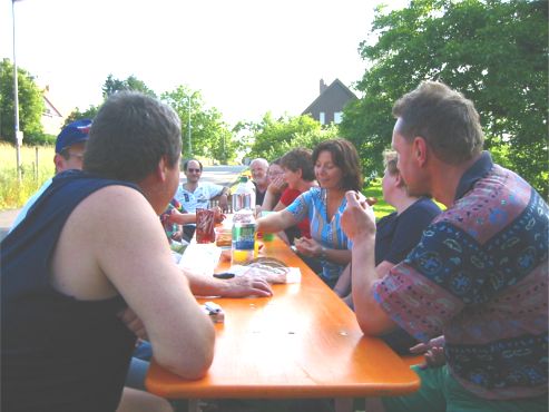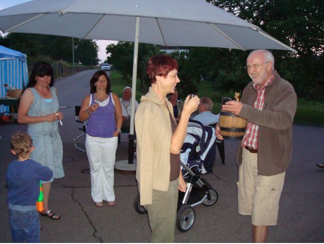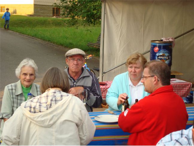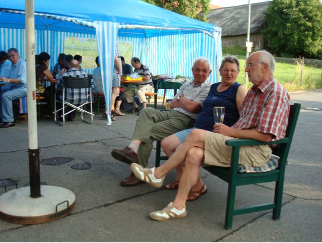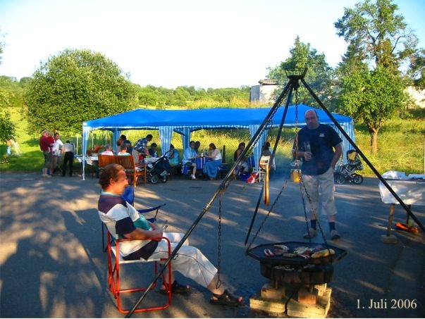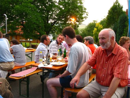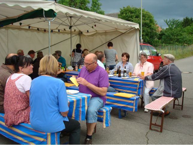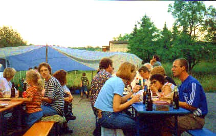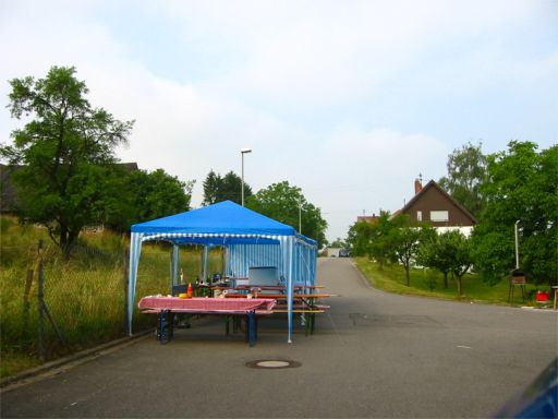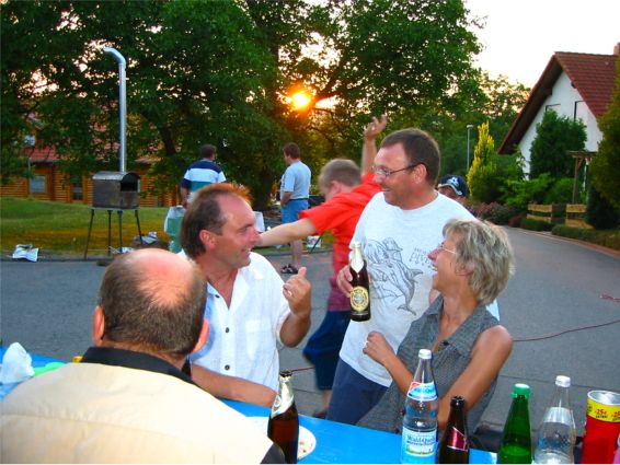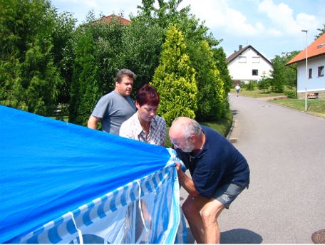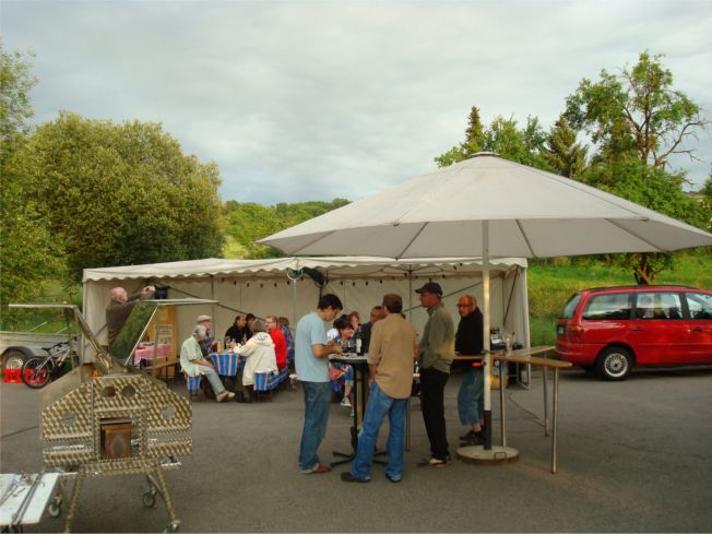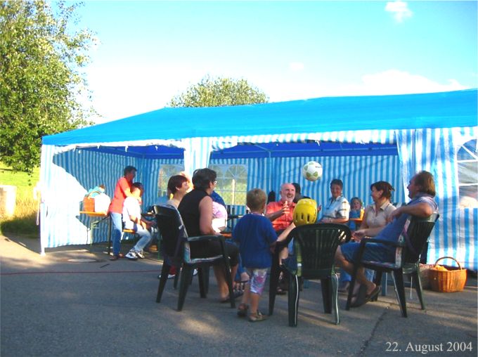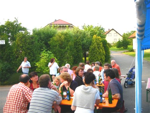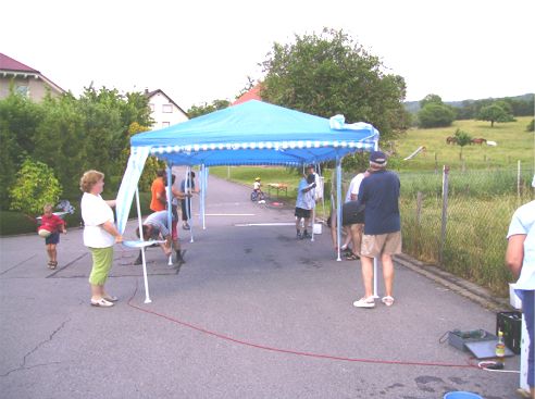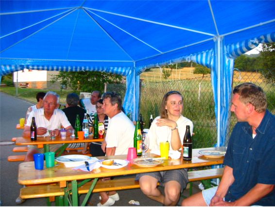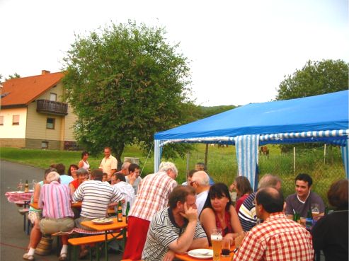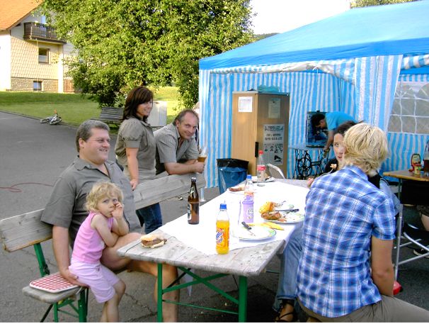 erstes Straßenfest Erstmals wurde in dem 1985 erweiterten Baugebiet "Zum Rech" ein Straßenfest gefeiert. Von Stefan "angeleiert" fanden die Anlieger in gemeinsamer Absprache schnell einen passenden Termin. Das für den Abend angekündigte Gewitter tat den Vorbereitungen keinen Abbruch, wohl aber sorgten aufziehende dunkelblaue Wolken dafür, dass kurzerhand mit einer Bauplane ein Zeltdach errichtet wurde.